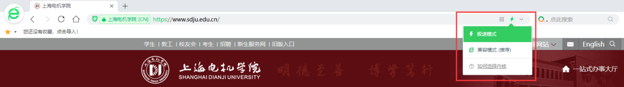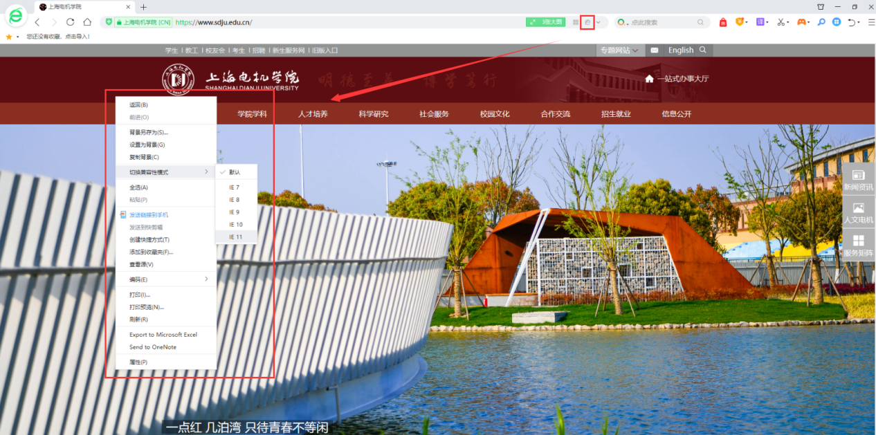2.设置内核:当页面在“兼容模式”下,可通过页面右键选择“切换兼容性模式”设定IE内核版本(推荐IE11)。