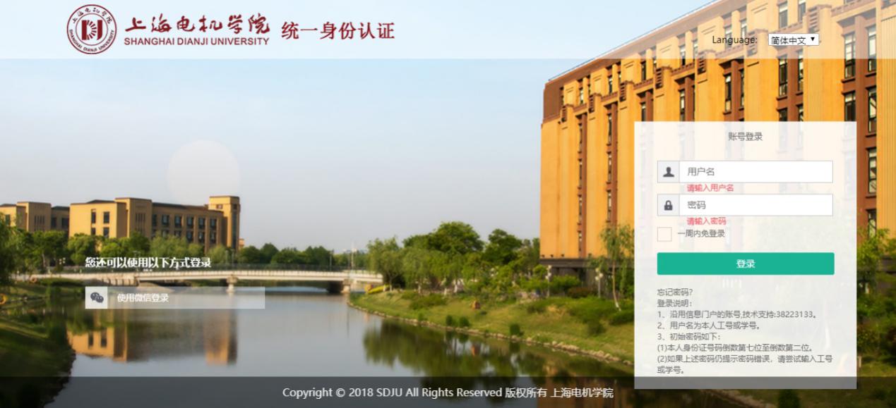 浏览器访问https://ehall.sdju.edu.cn,自动跳转至统一身份认证界面,输入工号/学号+密码登录。(校外访问请先登录VPN)
