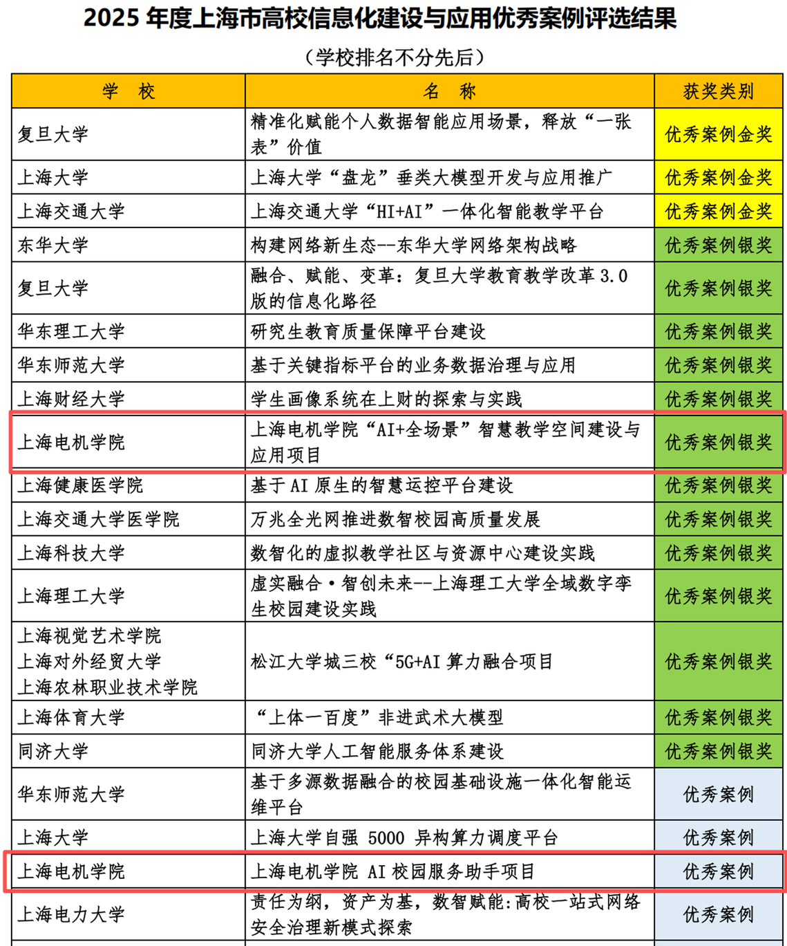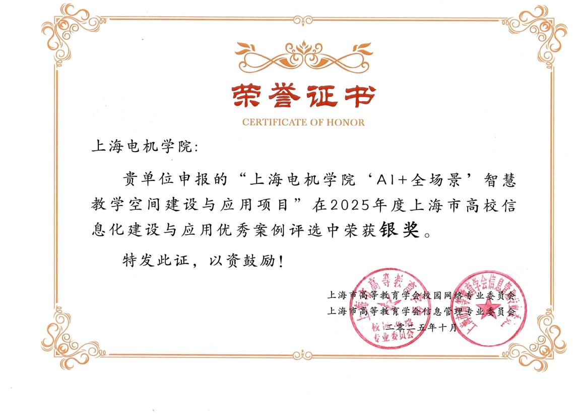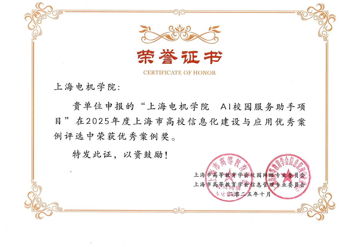 会上举行了优秀案例和先进个人颁奖仪式。我校申报的两个案例双双获奖,其中,“上海电机学院‘AI+全场景’智慧教学空间建设与应用项目”获2025年度上海市高校信息化建设与应用优秀案例银奖;“上海电机学院AI校园服务助手项目”获2025年度上海市高校信息化建设与应用优秀案例。国际教育学院朱许冰老师获评“2025年度上海高校信息化工作先进支持者”,网络安全和信息化办公室丁志锋老师获评“2025年度上海高校信息化工作先进个人”。这些荣誉的获得是对学校信息化工作的高度肯定,将激励学校信息化工作进一步向高质量内涵式发展。