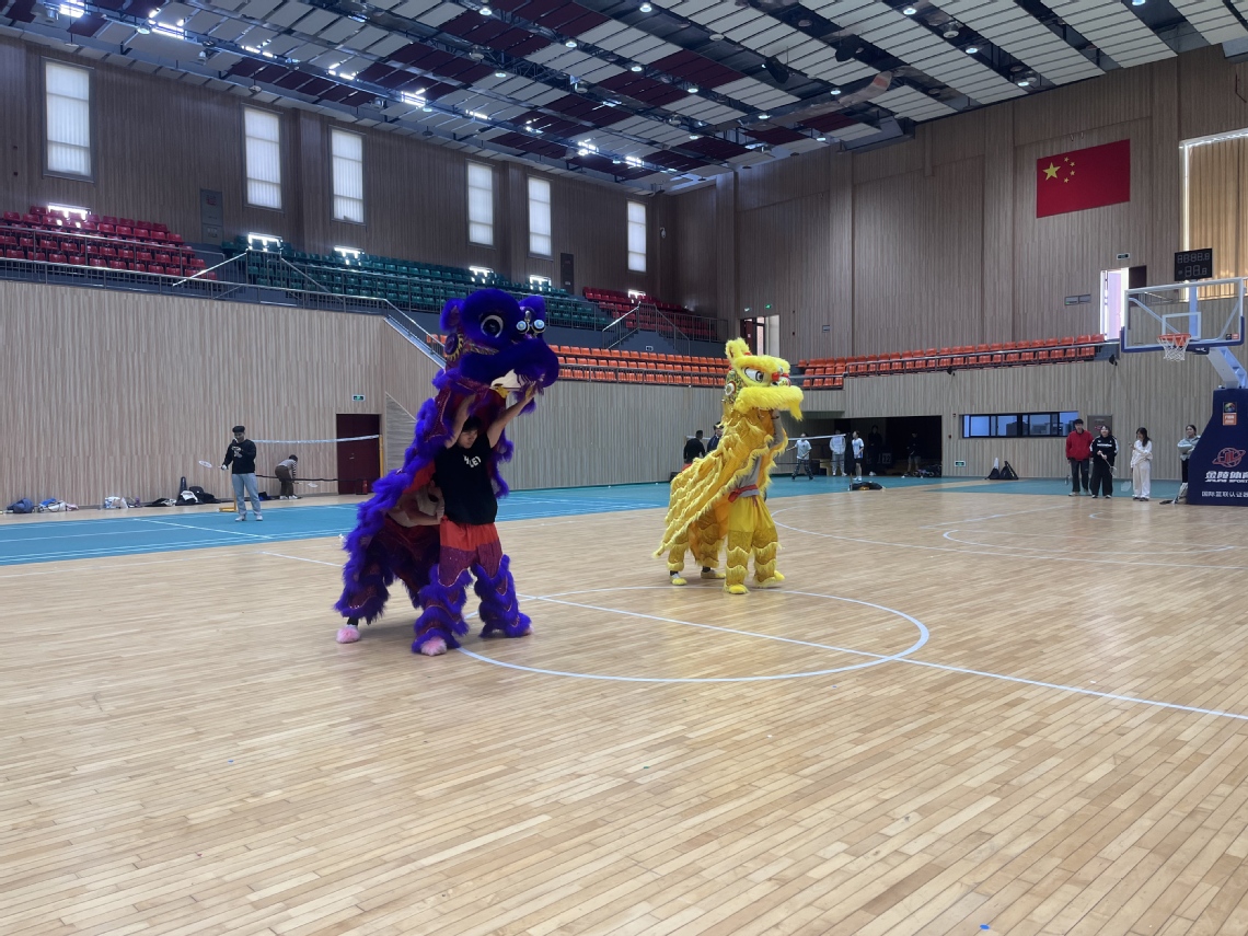 比赛开锣之前,学校舞狮队带来了一场气势恢宏、活力四射的开场表演。两只金红相间的雄狮随着铿锵的锣鼓声腾挪跳跃,时而威武灵动,时而憨态可掬,引来现场阵阵喝彩。他们以精湛的技艺和饱满的热情点燃了整个体育馆的气氛,为即将开始的比赛注入了蓬勃朝气与祥瑞之意。