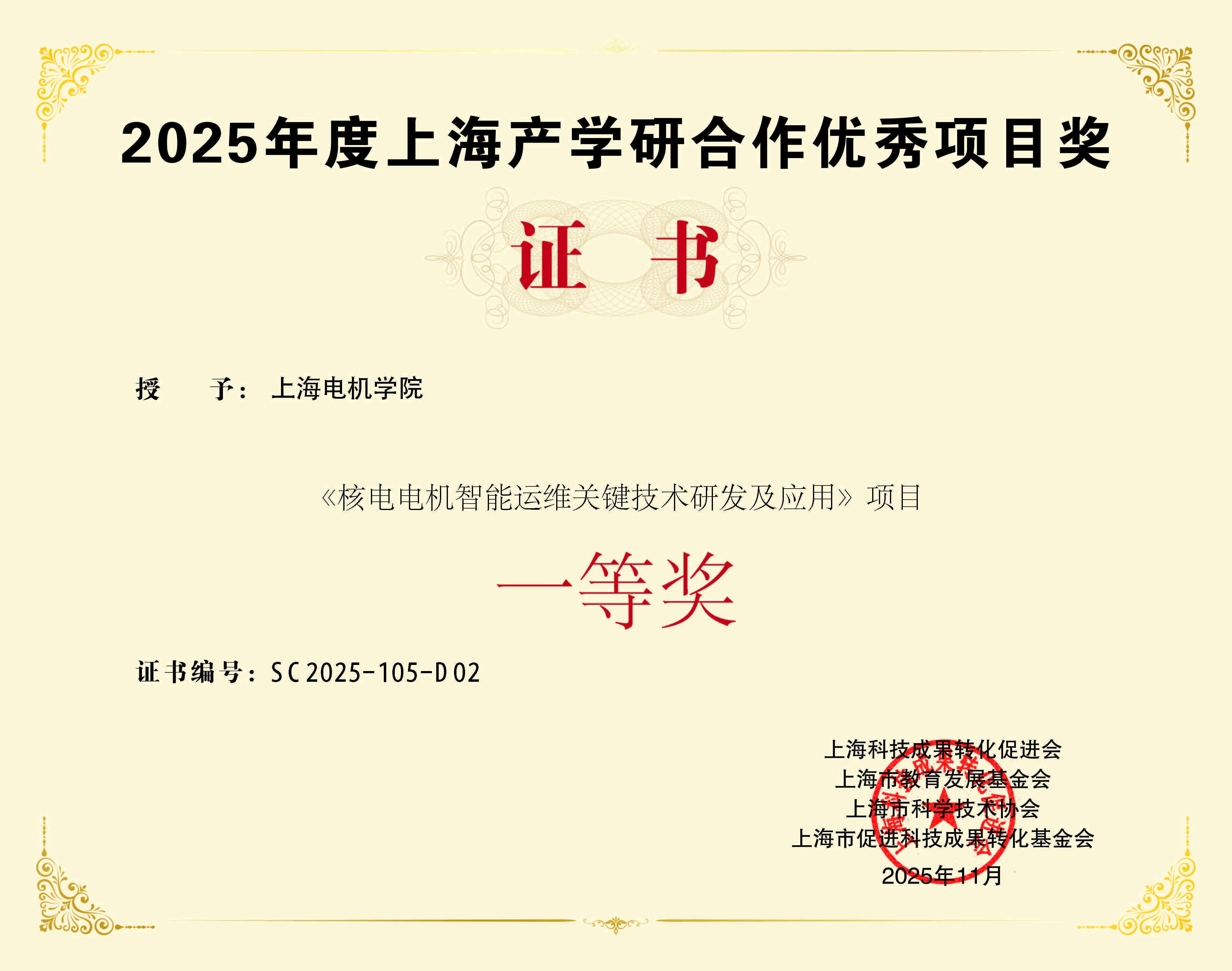 2025年12月26日上午,上海市政协科委(上海市科技成果转化促进会)主办的2025年度“上海产学研合作优秀项目奖”表彰大会于市政协隆重举行。上海市第十届政协主席蒋以任、市政协副主席吴信宝,市教育发展基金会、市科协、科促会等多位领导出席大会。上海电机学院与下属校办企业上海昂电电机有限公司联合申报的“核电电机智能运维关键技术研发及应用”从超200个申报项目中脱颖而出,荣获一等奖,标志着学校在产教融合与科技成果转化领域的社会认可度取得历史性突破。