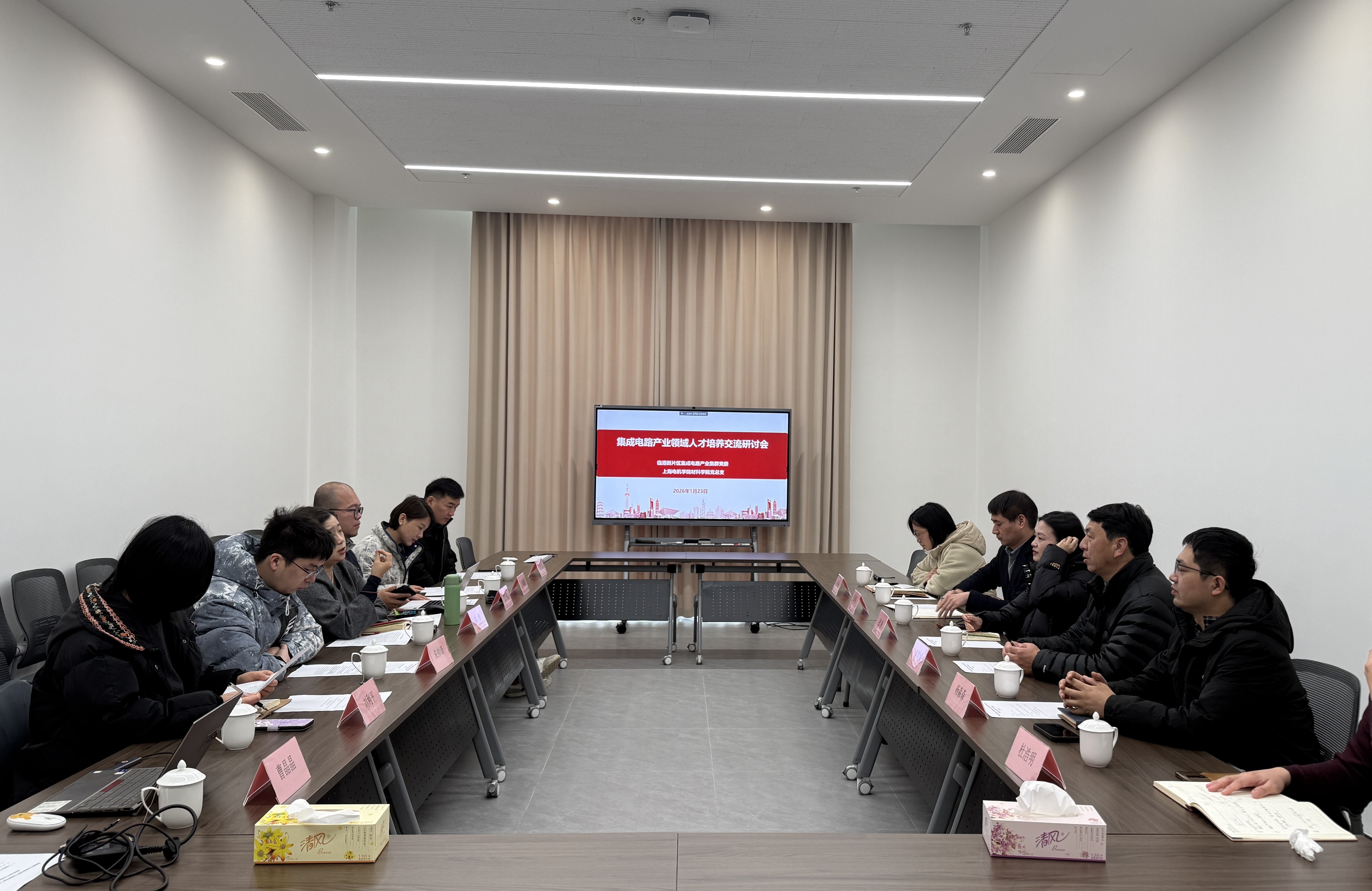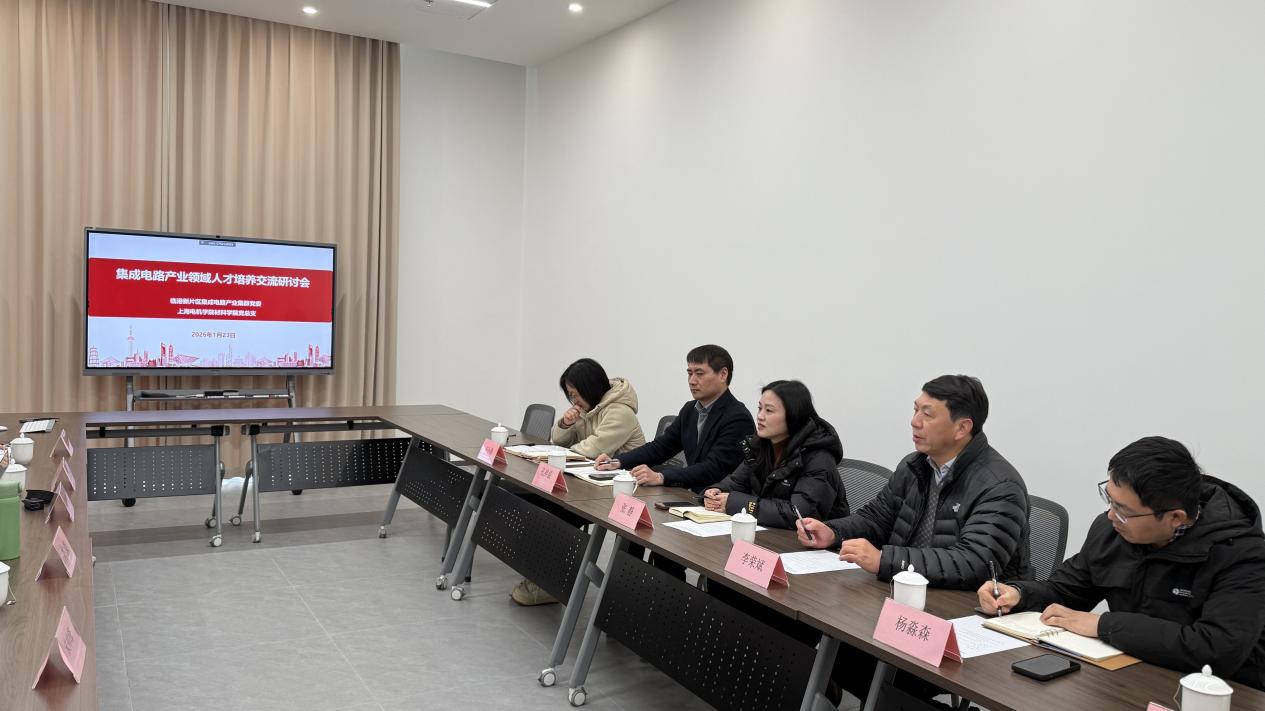 为深入推动学校集成电路产业领域人才培养创新平台建设,系统谋划“十五五”期间以高质量党建引领产教融合的示范带动作用,材料学院党总支与临港新片区集成电路产业集群党委于1月23日联合举办了一场专题交流研讨会,聚焦集成电路产业领域人才培养与创新合作机制。本次会议由集成电路产业集群党委书记刘焙主持,与会人员包括集成电路产业集群党委委员、产业集群下辖多家重点企业代表以及材料学院党政领导班子全体成员。各方围绕产学研协同创新、校企协同育人、资源共享与需求对接等关键议题展开了深入交流和务实讨论。