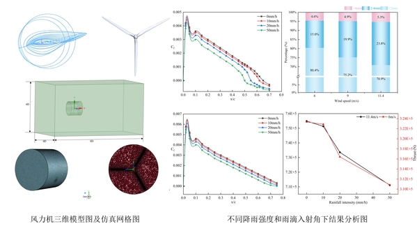 针对海上风机强降雨服役环境,课题组建立欧拉-拉格朗日风雨两相流耦合模型,系统研究降雨强度、雨滴入射角对叶片载荷与流场的影响机制,成果发表于海洋工程与可再生能源领域知名期刊《Ocean Engineering》。研究首次阐明:低风速区雨滴动量注入主导载荷响应,中高风速区气动性能退化占优;额定风速下,降雨强度50 mm/h时转子推力损失达5.8%,雨滴入射角45°时推力呈0.71 kN/°梯度下降;揭示“微观雨滴分布—宏观转子载荷”内在耦合机制,为海上风机抗雨蚀设计与控制优化提供理论依据。