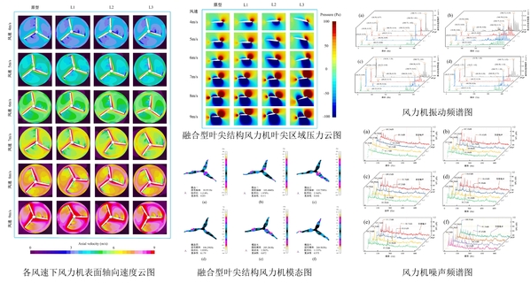 课题组原创融合式叶尖结构,借鉴航空融合翼减涡减振原理,开展多工况风洞试验与数值模拟,相关成果连续发表于能源领域知名期刊《Energy》和海洋工程与可再生能源领域知名期刊《Ocean Engineering》。核心发现:融合叶尖可使风机低频振动加速度幅值降低5.23%–71.43%,噪声声压级降低1.63%–11.65%;叶尖折角越大,减振降噪效果越优,45°折叠方案(L3)减振幅度最高达49.63%;风机风能利用系数最大提升15.05%,轴向速度与涡量分别降低26.07%、31.28%,显著改善尾迹流场特性。该结构兼具减振、降噪、增功三重优势,已获多项国家发明专利授权,具备良好工程转化前景。