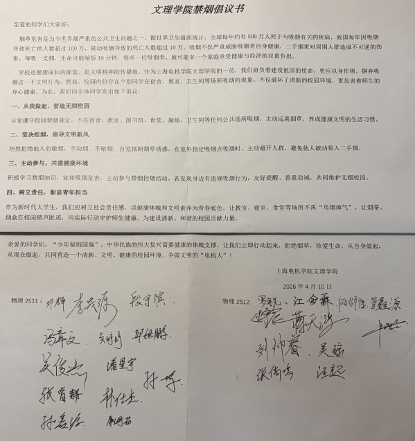 校园无烟草,青春更飞扬。无烟校园专项整治月的开启,不仅是上海电机学院落实公共场所控烟要求的具体实践,更是学校以青年为主体,深化文明素养培育、推进健康校园建设的重要举措。今后,学校将以此次专项整治为契机,持续完善无烟校园建设长效管理机制,把禁烟工作融入日常、抓在经常,引导广大师生自觉做文明行动的践行者、文明新风的传播者,共同守护清朗健康的校园家园,让文明之花在电机校园处处绽放。(供稿:学生处)