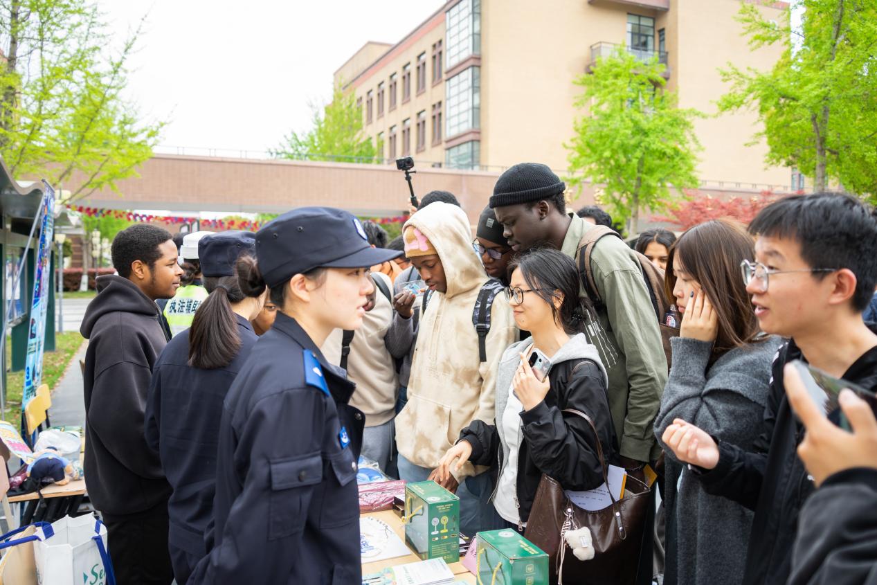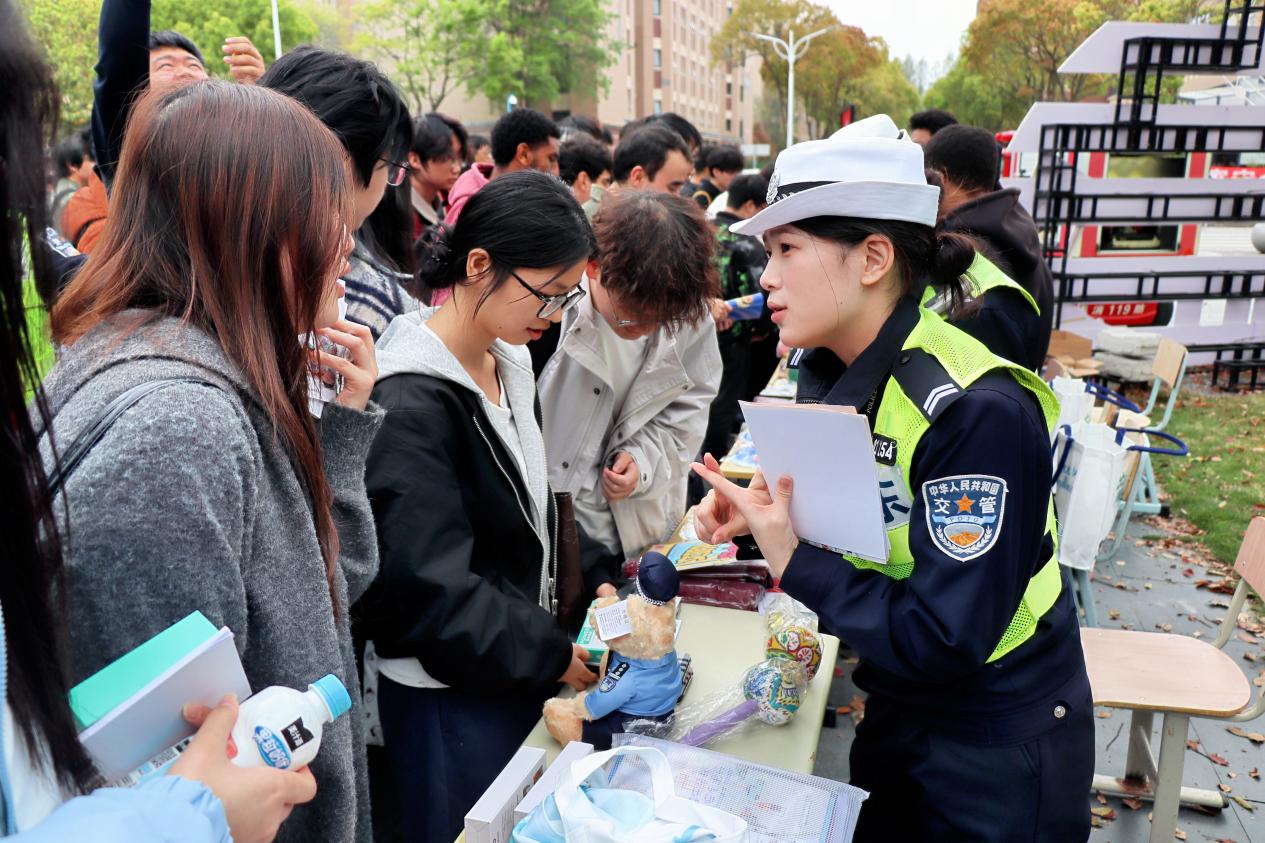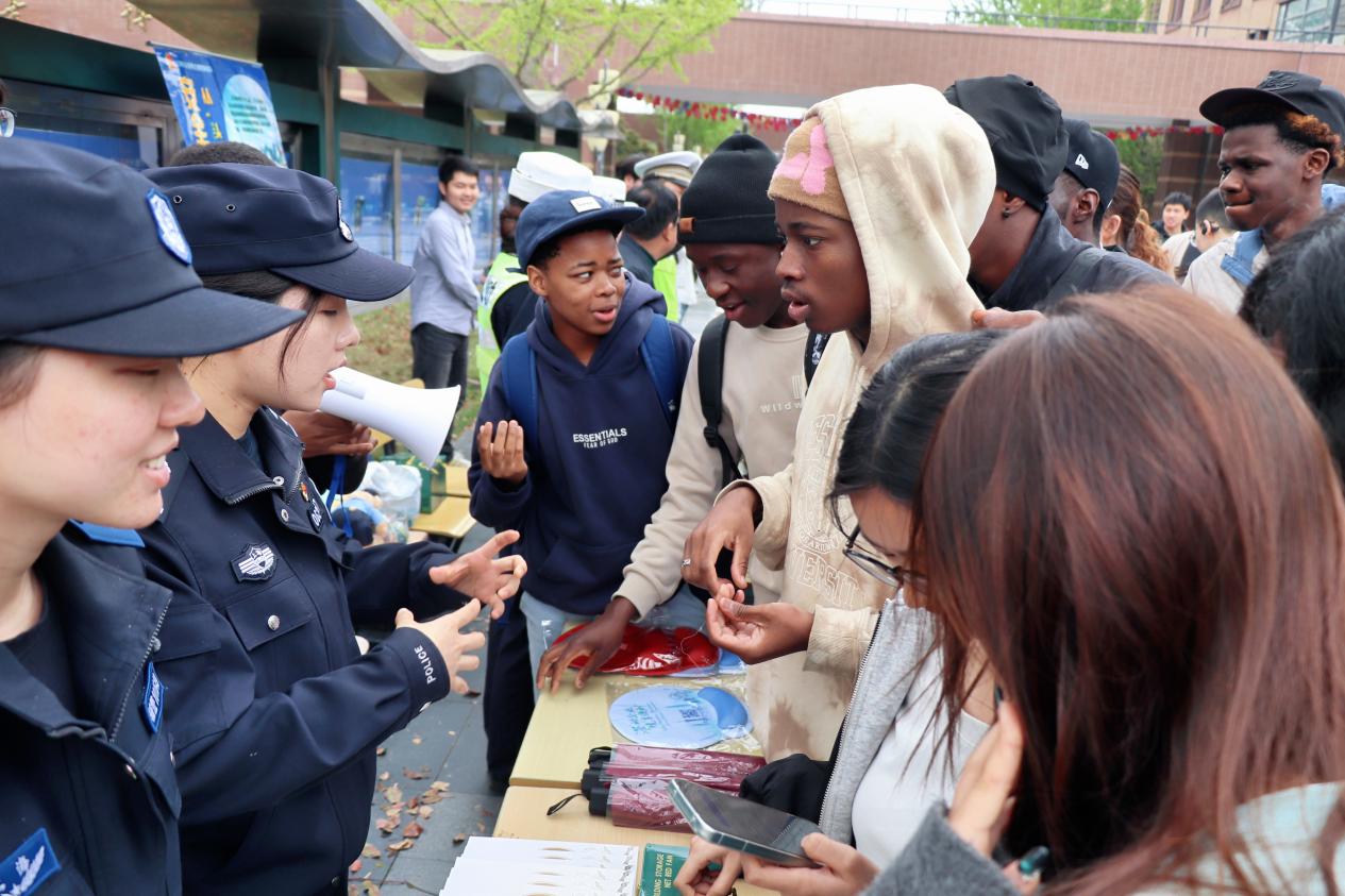 协同联动:多方宣讲汇聚合力。活动期间,半月广场化身为国家安全教育的“实景课堂”。学校党政办、宣传部、保卫处、保密办等部门携手浦东出入境管理支队、临港高校派出所、交通管理等部门联合进驻,面向不同师生群体开展靶向式宣传教育。保密办通过案例展板和现场讲解,普及保密法律法规和日常保密常识,提醒师生“保密无小事,言行需谨慎”;出入境工作人员专门面向留学生群体,解读涉外法律法规和签证政策,帮助留学生增强安全防范意识;临港高校派出所民警结合近期高发的刷单返利、冒充熟人等真实案例,剖析诈骗手法,传授“不轻信、不透露、不转账”的防骗要诀;交警通过展板展示、头盔佩戴演示、事故案例警示等方式,重点讲解电动自行车骑行规范与交通安全知识,引导师生养成文明出行习惯。多部门协同发力,让国家安全教育在互动体验与联合宣讲中落地生根。