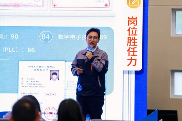 在全国总决赛主题陈述环节,他以“做非标自动化电气工程师,赋能智能制造转型升级”为演讲主线,从自身工程实践出发,结合行业发展趋势与个人成长规划,向评委和企业代表阐述了清晰的职业路径。在综合面试环节,面对评委关于“非标设备现场复杂工艺问题解决能力”的专业提问,他凭借扎实的项目经验和逻辑清晰的应答思路赢得了评委的高度认可,最终斩获全国铜奖,在总决赛现场还收获了企业录用意向。