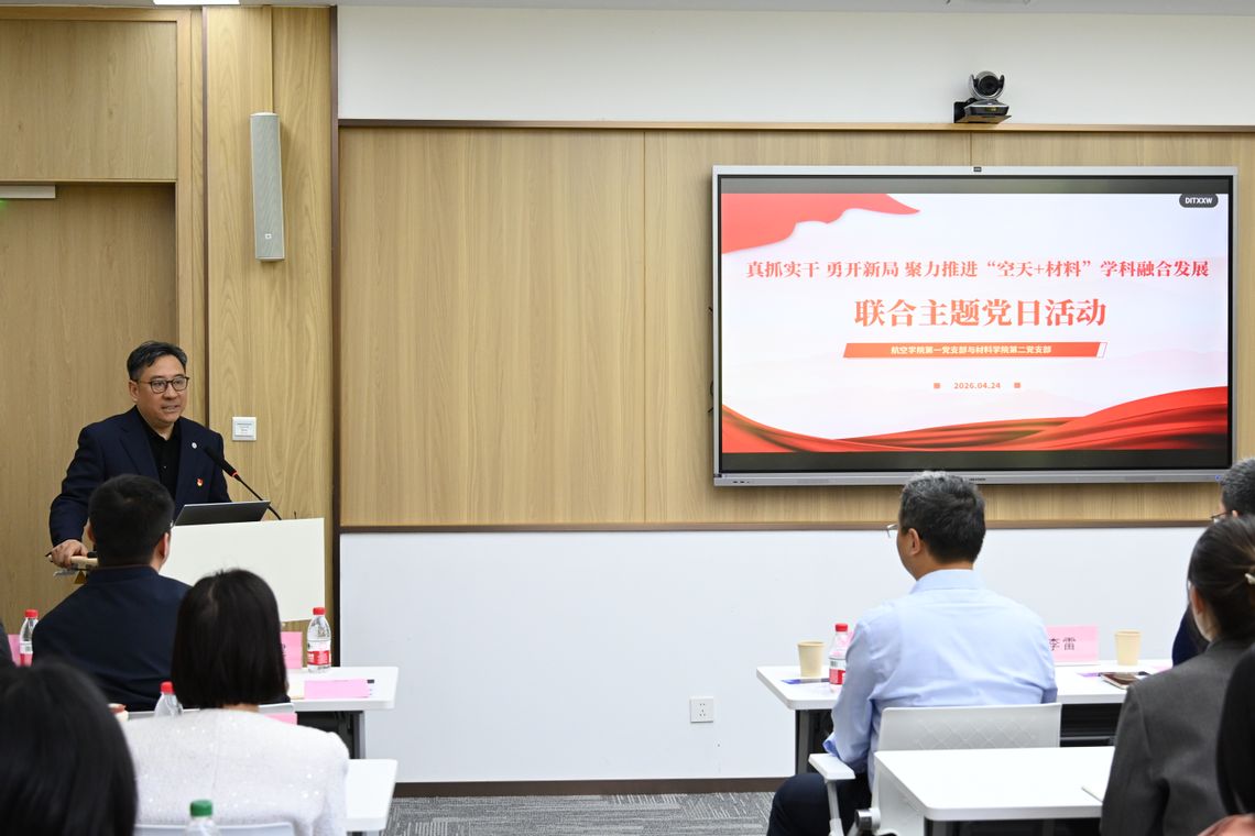为深化党建引领科研建设,助推跨学科交叉融合与协同创新,2026年4月24日下午,航空学院第一党支部与材料学院第二党支部于产教融合楼开展联合主题党日活动。校党委书记鲁雄刚出席活动,两院党员、骨干教师参会,聚焦“空天+材料”融合赛道,共探学科协同、科研共建新思路。